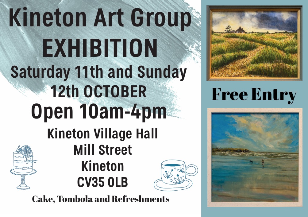 The dates for the October exhibition are: Saturday 11th October 2025, 10am-5pm; and Sunday 12th October 2025 10am-4pm. The exhibition will be held at the village hall: Kineton Village Hall, Mill Street, Kineton. CV35 0LB